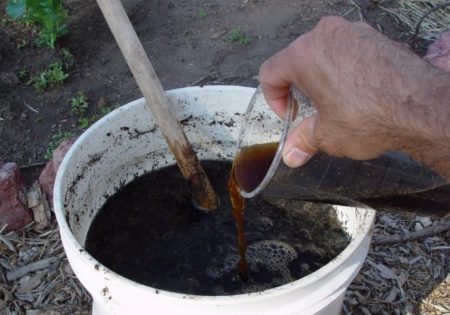 Sammensætningen fremstilles som følger: tag 1 liter. frisk mullein og placeret i 10 liter. vand. Det kan erstattes med 500 ml. fuglevækker. 40-50 g superphosphat sættes til opløsningen og henstilles i 10-12 dage. Før brug fortyndes blandingen med vand i forholdet 1: 1.