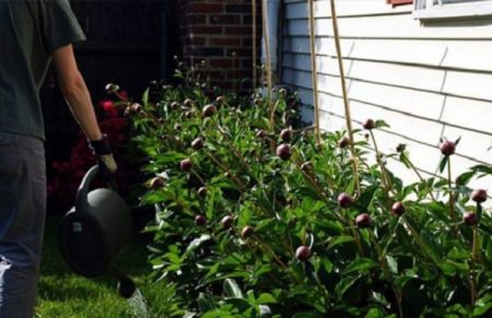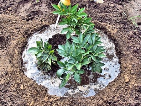 Fodringsreglerne er som følger: omkring pioner i en afstand af 20 cm, lav en lille fure med en dybde på 10-15 cm. 1 spand med sammensætningsblader til 1 busk.